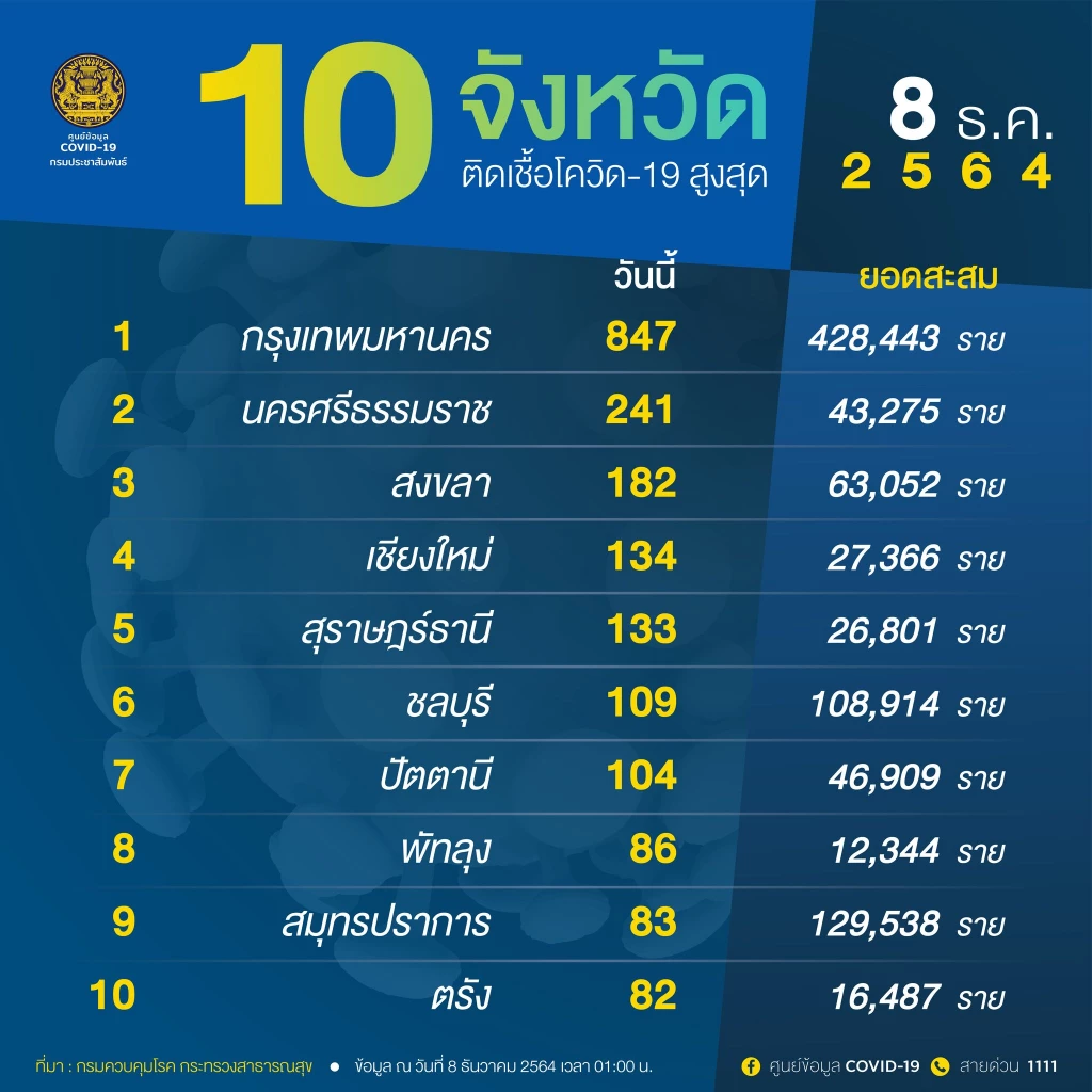10 อันดับ ผู้ติดเชื้อรายใหม่ในประเทศไทยวันที่ 8 ธ.ค.64