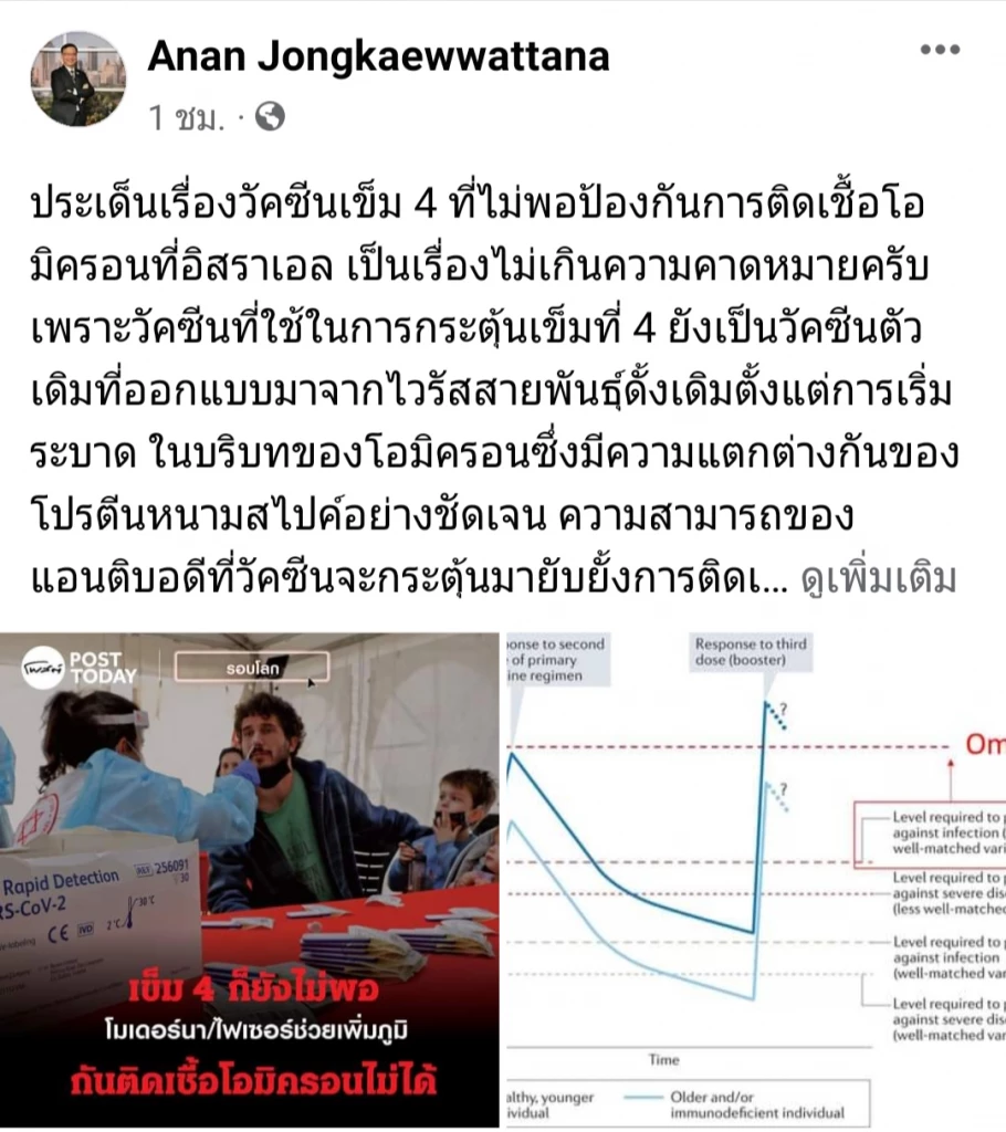 ง.อนันต์ จงแก้ววัฒนา นักไวรัสวิทยา ผู้อำนวยการกลุ่มวิจัยนวัตกรรมสุขภาพสัตว์และการจัดการ ศูนย์พันธุวิศวกรรมและเทคโนโลยีชีวภาพแห่งชาติ (ไบโอเทค) โพสต์ข้อความผ่านเฟซบุ๊ก Anan Jongkaewwattana ในประเด็นเรื่อง "วัคซีนเข็ม 4" ที่ไม่พอป้องกันการติดเชื้อ "โอไมครอน" ที่อิสราเอล เป็นเรื่องไม่เกินความคาดหมายครับ เพราะวัคซีนที่ใช้ในการกระตุ้นเข็มที่ 4 ยังเป็นวัคซีนตัวเดิมที่ออกแบบมาจากไวรัสสายพันธุ์ดั้งเดิมตั้งแต่การเริ่มระบาด ในบริบทของ "โอไมครอน" ซึ่งมีความแตกต่างกันของโปรตีนหนามสไปค์อย่างชัดเจน ความสามารถของแอนติบอดีที่วัคซีนจะกระตุ้นมายับยั้งการติดเชื้อได้จะน้อยลงไปด้วย