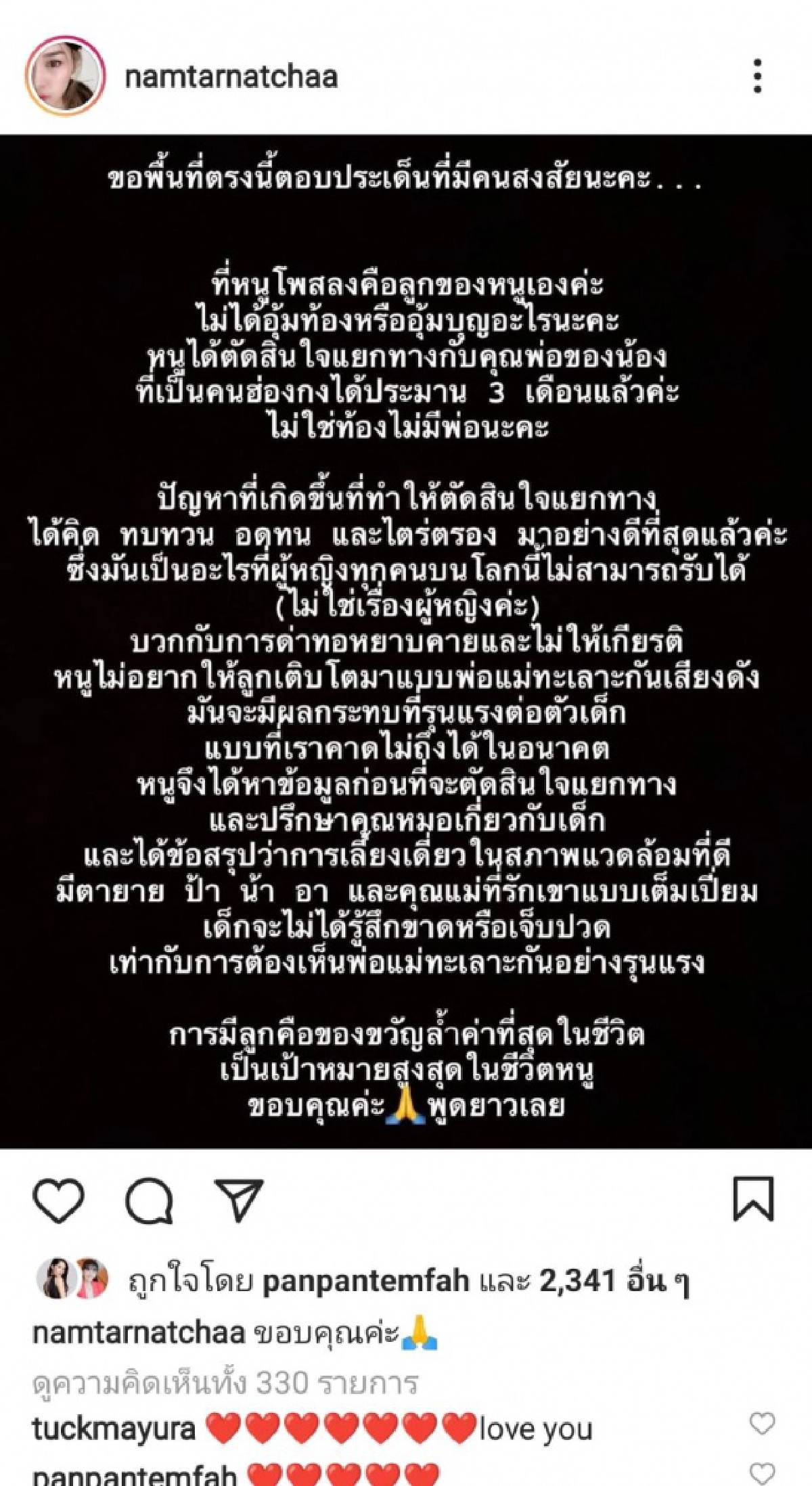 "ขอพื้นที่ตรงนี้ตอบประเด็นที่มีคนสงสัยนะคะ... ที่หนูโพสลงคือลูกของหนูเองค่ะไม่ได้อุ้มท้องหรืออุ้มบุญอะไรนะคะ หนูได้ตัดสินใจแยกทางกับคุณพ่อของน้องที่เป็นคนฮ่องกงได้ประมาน 3 เดือนแล้วค่ะ ไม่ใช่ท้องไม่มีพ่อนะคะปัญหาที่เกิดขึ้นที่ทำให้ตัดสินใจแยกทางทบทวน อดทน และไตร่ตรอง มาอย่างดีที่สุดแล้วค่ะซึ่งมันเป็นอะไรที่ผู้หญิงทุกคนบน โลกนี้ไม่สามารถรับได้(ไม่ใช่เรื่องผู้หญิงค่ะ) บวกกับการด่าทอหยาบคายและไม่ให้เกียรติหนูไม่อยากให้ลูกเติบโตมาแบบพ่อแม่ทะเลาะกันเสียงดัง มันจะมีผลกระทบที่รุนแรงต่อตัวเด็กแบบที่เราคาดไม่ถึงได้ในอนาคต หนูจึงได้หาข้อมูลก่อนที่จะตัดสินใจแยกทางและปรึกษาคูณหมอเกี่ยวกับเด็กและได้ข้อสรุปว่าการเลี้ยงเดี๋ยวในสภาพแวดล้อมที่ดีป้า น้าอา และคุณแม่ที่รักเขาแบบเต็มเปี่ยมเด็กจะไม่ได้รู้สึกขาดหรือเจ็บปวดเท่ากับการต้องเห็นพ่อแม่ทะเลาะกันอย่างรุนแรงการมีลูกคือของขวัญล้ำค่าที่สุดในชีวิตเป็นเป้าหมายสูงสุดในชีวิตหนูขอบคุณค่ะพูดยาวเลย"