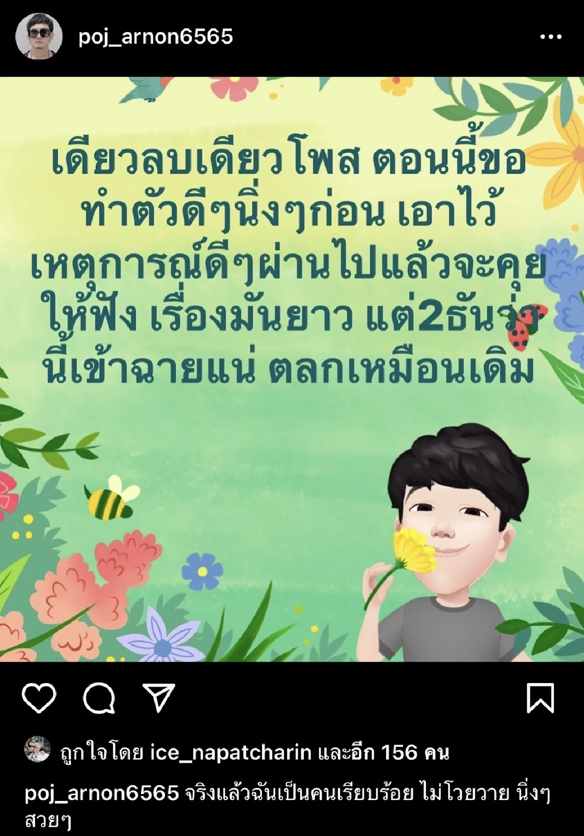 และหลังจากนั้นไม่นาน "พชร์ อานนท์" ก็ได้ลบโพสต์ดังกล่าวไป และโพสต์ภาพที่มีข้อความใหม่อีกครั้งว่า "เดี๋ยวลบ เดี๋ยวโพสต์ ตอนนี้ขอทำตัวดีๆนิ่งๆก่อน เอาไว้เหตุการณ์ดีๆ ผ่านไปแล้วจะคุยให้ฟัง เรื่องมันยาว แต่ 2 ธันวาคมนี้เข้าฉายแน่ ตลกเหมือนเดิม" พร้อมแคปชั่นว่า "จริงแล้วฉันเป็นคนเรียบร้อย ไม่โวยวาย นิ่งๆสวยๆ"