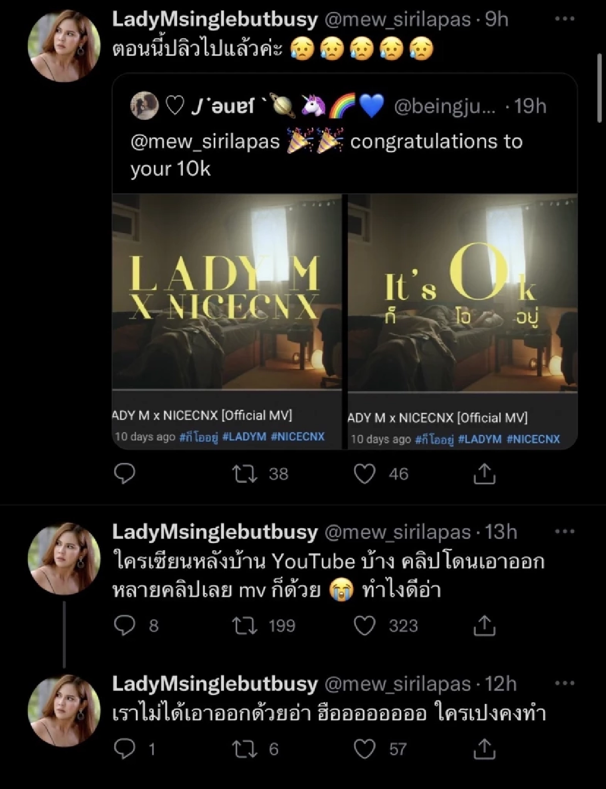 โดยข้อความที่ "หมิว สิริลภัส" ออกมาทวิตให้ทราบกันนั้นมีเนื้อหาชี้ว่า "ใครเซียนหลังบ้าน YouTube บ้าง คลิปโดนเอาออกหลายคลิปเลย mv ก็ด้วย ทำไงดีอ่า , เราไม่ได้เอาออกด้วยอ่า ฮืออออออออ ใครเปงคงทำ , ตอนนี้ปลิวไปแล้วค่ะ" พร้อมภาพอิโมจิปประกอบอย่างเศร้าใจ