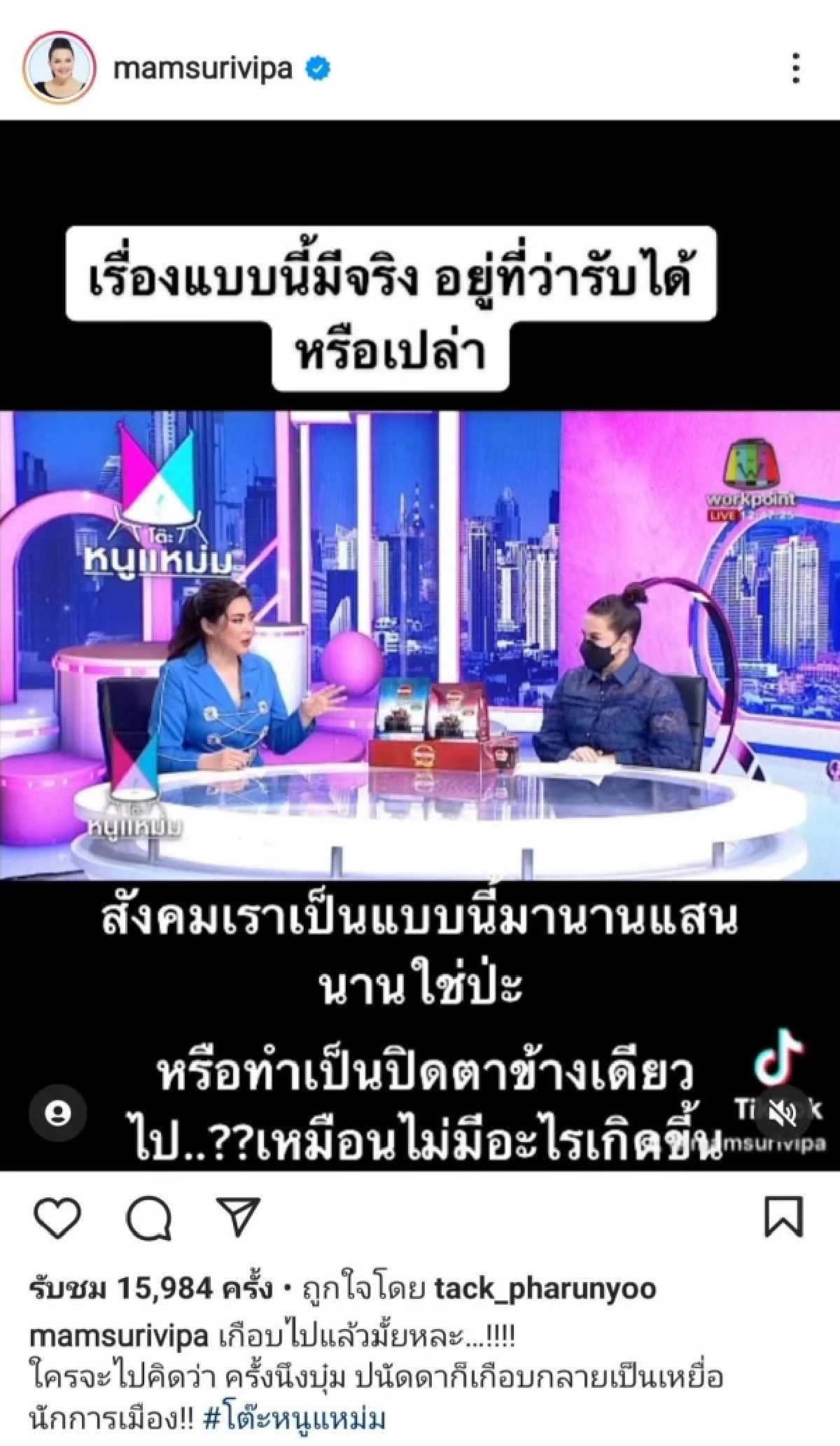 และนอกจากที่ "แหม่ม สุริวิภา" จะโพสต์คลิปในขณะที่ "บุ๋ม ปนัดดา" เล่าประสบการณ์ระทึกแล้ว ยังได้เขียนข้อความลงในคลิปอีกว่า "เรื่องแบบนี้มีจริง อยู่ที่ว่ารับได้หรือเปล่า สังคมเราเป็นแบบนี้มานานแสนนานใช่ปะ หรือทำเป็นปิดตาข้างเดียวไป..?? เหมือนไม่มีอะไรเกิดขึ้น"