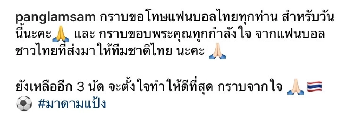 โดยเมื่อวานนี้ (7 พฤษภาคม 65) หลังจากทีมชาติไทย พ่ายแพ้ ให้กับ ทีมชาติมาเลเซีย ด้วยสกอร์ 1-2 ในการแข่งขันกีฬาซีเกมส์ 2021 ครั้งที่ 31 ที่กรุงฮานอย ประเทศเวียดนาม ก็ทำเอา "มาดามแป้ง" ได้โพสต์ภาพนักฟุตบอลทีมชาติไทย หลายรูปแบบรัวๆ พร้อมกับเขียนข้อความขอโทษ ระบุว่า "กราบขอโทษแฟนบอลไทยทุกท่าน สำหรับวันนี้นะคะ และกราบขอบพระคุณทุกกำลังใจ จากแฟนบอลชาวไทยที่ส่งมาให้ทีมชาติไทยนะคะ ยังเหลืออีก 3 นัด จะตั้งใจทำให้ดีที่สุด กราบจากใจ TH #มาดามแป้ง"