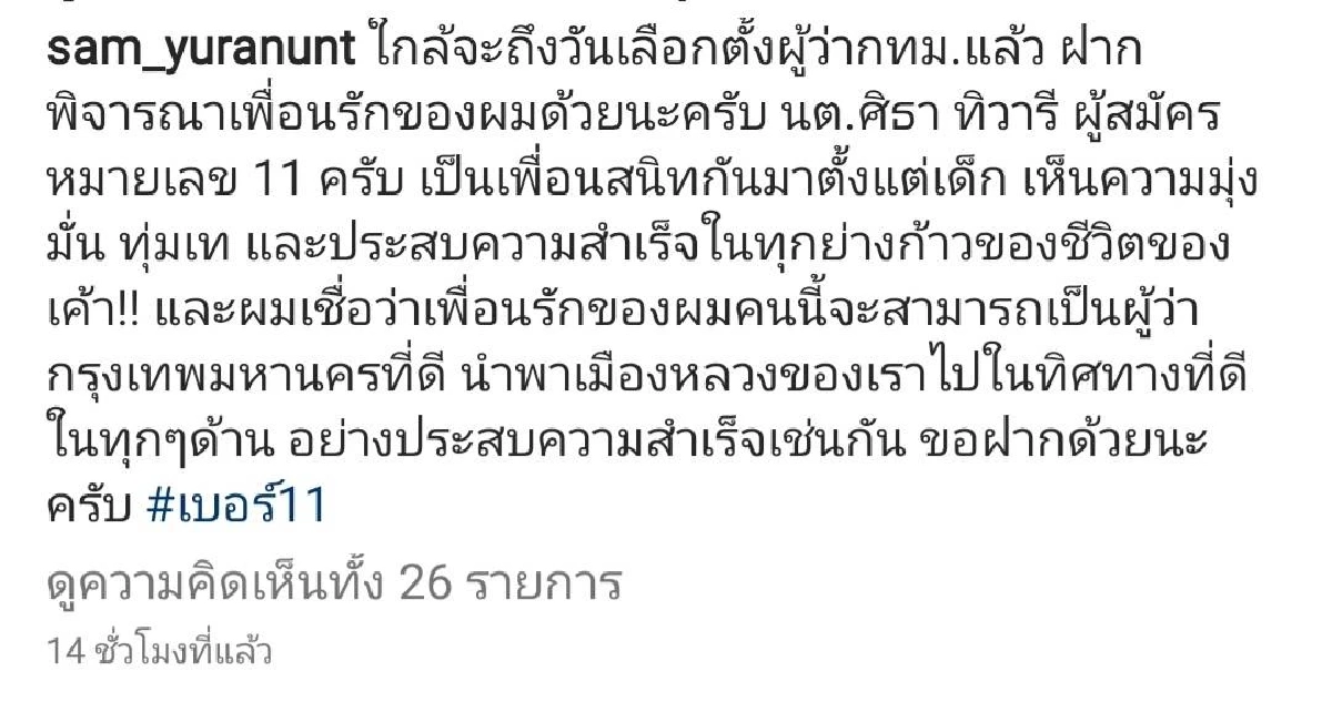 ในขณะที่ หนุ่ม "แซม ยุรนันท์" ก็ได้โพสต์ภาพชวนเลือกตั้งผู้ว่าฯ กทม. พร้อมกับเขียนข้อความแสดงความคิดเห็นส่วนตัวเช่นเดียวกัน ระบุว่า "ใกล้จะถึงวันเลือกตั้งผู้ว่ากทม.แล้ว ฝากพิจารณาเพื่อนรักของผมด้วยนะครับ นต.ศิธา ทิวารี ผู้สมัครหมายเลข 11 ครับ เป็นเพื่อนสนิทกันมาตั้งแต่เด็ก เห็นความมุ่งมั่น ทุ่มเท และประสบความสำเร็จในทุกย่างก้าวของชีวิตของเค้า!! และผมเชื่อว่าเพื่อนรักของผมคนนี้จะสามารถเป็นผู้ว่ากรุงเทพมหานครที่ดี นำพาเมืองหลวงของเราไปในทิศทางที่ดี ในทุกๆด้าน อย่างประสบความสำเร็จเช่นกัน ขอฝากด้วยนะครับ #เบอร์11"