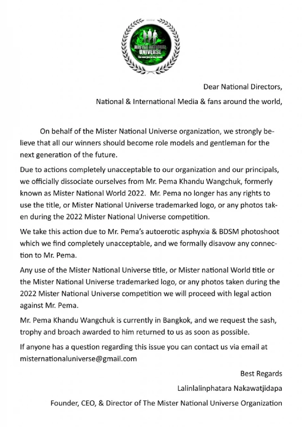 โดยกองประกวด โพสต์แถลงการณ์ลงเฟซบุ๊ก Mister National Universe ระบุว่า...ในนามขององค์กร Mister National Universe เราเชื่อมั่นว่าผู้ชนะการประกวดทุกคนควรจะเป็นแบบอย่างและเป็นสุภาพบุรุษสำหรับคนยุคต่อไปในอนาคตเนื่องจากการประทำอันไม่เป็นที่ยอมรับขององค์กร รวมถึงผู้บริหารของเรา เราจึงขอปลด นายเปมา คันดู วังชุก หรือที่เคยรู้จักในฐานะ Mister National World 2022 โดยเขาจะไม่มีสิทธิ์ในการใช้ชื่อตำแหน่งหรือโลโก้เครื่องหมายการค้าใดของ Mister National Universe อีกต่อไป รวมถึงรูปที่ถ่ายระหว่างการประกวด 2022 Mister National Universe