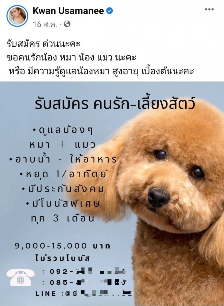 และหลังจากที่มีประเด็นดราม่านี้เกิดขึ้น ก็มีชาวเน็ตหลายคนต่างพุ่งเป้า และ โยงไปที่ นางเอกดัง "ขวัญ อุษามณี" เพราะถ้าย้อนไปดูในเฟซบุ๊กส่วนตัว Kwan Usamanee ของสาว "ขวัญ" จะพบว่าเมื่อช่วงเดือนกรกฎาคม และ สิงหาคม 2565 ที่ผ่านมา สาว "ขวัญ" เพิ่งจะมีการโพสต์รับสมัครคนมาดูแลสุนัข และ แมว แถมพิกัดบ้านยังอยู่ย่านรามอินทรา พร้อมกับลงรายละเอียดคุณสมบัติต่างๆ อย่างชัดเจน รวมถึง รายได้เงินเดือนของคนที่มาสมัครจะได้รับอะไรบ้าง มีการเขียนระบุว่า...