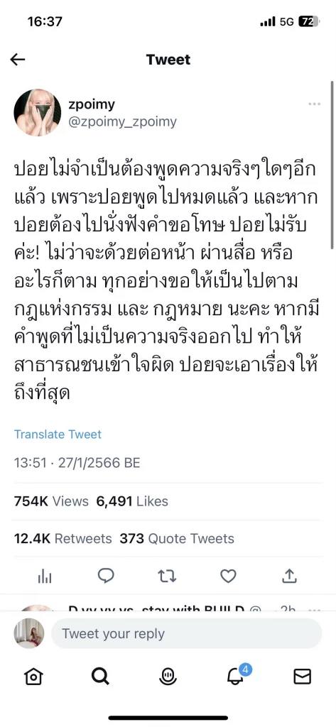"ปอยไม่จำเป็นต้องพูดความจริงๆใดๆอีกแล้ว เพราะปอยพูดไปหมดแล้ว และหากปอยต้องไปนั่งฟังคำขอโทษ ปอยไม่รับค่ะ! ไม่ว่าจะด้วยต่อหน้า ผ่านสื่อ หรืออะไรก็ตาม ทุกอย่างขอให้เป็นไปตามกฎแห่งกรรม และ กฎหมาย นะคะ หากมีคำพูดที่ไม่เป็นความจริงออกไป ทำให้สาธารณชนเข้าใจผิด ปอยจะเอาเรื่องให้ถึงที่สุด”