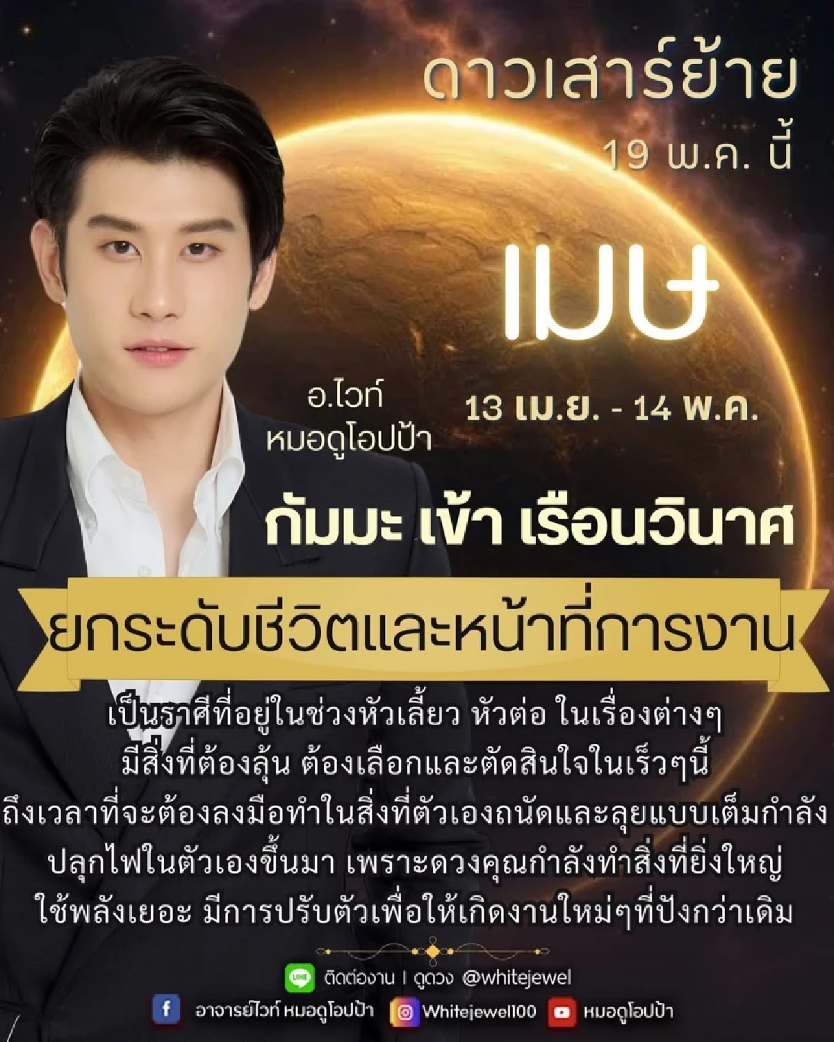 เช็ก"5 ราศี" เสาร์ย้าย 19/5/68 หนึ่งในดราวตรีเทพ หมอดูชื่อดัง หมอไวท์ เปิดดวง ทายทักแล้ว "เงินเข้ารัวๆ บ้านรถ ครบ" ได้ชัวร์ๆ