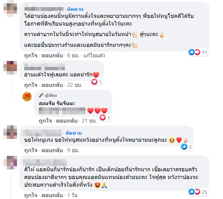 โดยหลังจากเรื่องราวของเพจดัง "สอนภาษาจีน" นี้ได้ถูกเผยแพร่ไปก็มีชาวเน็ตเข้ามาคอมเมนต์ด้วยความชื่นชมกันอย่างคับคั่ง ไม่ว่าจะเป็น ได้อ่านน้องคนนี้หนูมีความตั้งใจและพยายามมาก ๆ พี่ขอให้หนูโชคดีได้รับโอกาสที่ดี ๆ เรียนจบสูง ๆ อย่างที่หนูตั้งใจไว้นะคะ ความลำบากในวันนี้จะทำให้หนูสบายในวันหน้า สู้ ๆ นะคะ และขอชื่นชมทางร้านและแอดมินน่ารักมาก ๆ ค่ะ, อ่านแล้วใจฟูเลยค่ะ แอดน่ารัก และ อ่านแล้วน้ำตาไหลเลย น้องมีความน่ารักและความเกรงใจ ส่วนแอดก็มีความน่ารักและเมตตา เป็นต้น