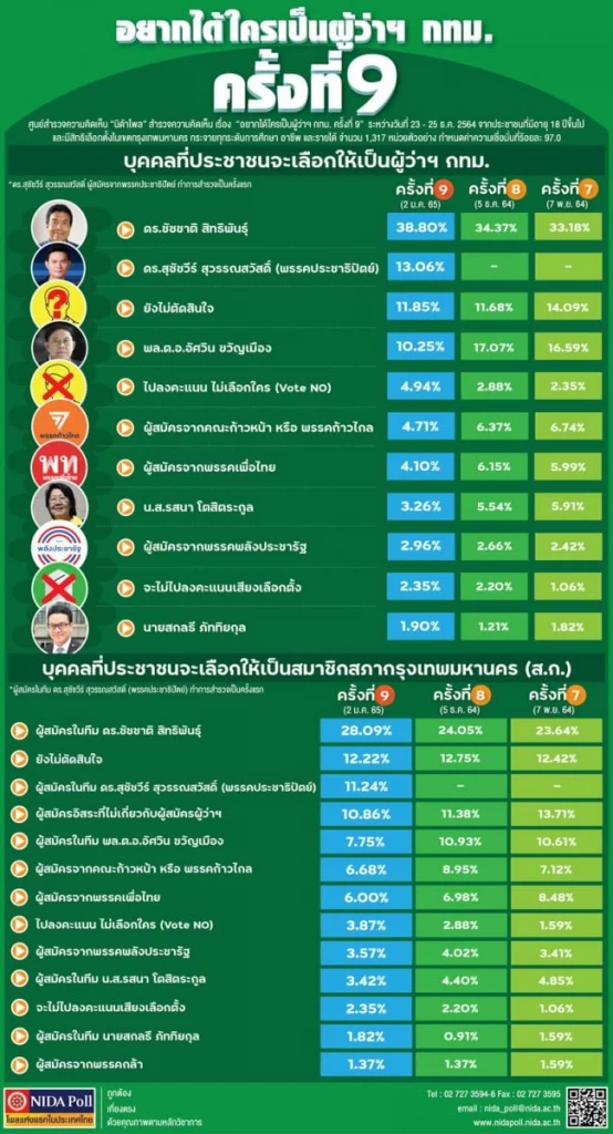 ศูนย์สำรวจความคิดเห็น "นิด้าโพล" สถาบันบัณฑิตพัฒนบริหารศาสตร์ (นิด้า) เปิดเผยผลสำรวจของประชาชน เรื่อง "อยากได้ใคร เป็นผู้ว่าฯ กทม. ครั้งที่ 9" ทำการสำรวจระหว่างวันที่ 23-25 ธันวาคม 2564 จากประชาชนที่มีอายุ 18 ปีขึ้นไป และมีสิทธิเลือกตั้ง ในกรุงเทพมหานคร กระจายทุกระดับการศึกษาอาชีพ และรายได้ รวมทั้งสิ้น จำนวน 1,317 หน่วยตัวอย่าง เกี่ยวกับประชาชนอยากได้ใครเป็น "ผู้ว่าฯ กทม." ครั้งที่ 9 การสำรวจอาศัยการสุ่มตัวอย่างโดยใช้ความน่าจะเป็นจากบัญชีรายชื่อฐานข้อมูลตัวอย่างหลัก (Master Sample) ของ "นิด้าโพล" สุ่มตัวอย่างด้วยวิธีแบบง่าย (Simple Random Sampling) เก็บข้อมูลด้วยวิธีการสัมภาษณ์ทางโทรศัพท์ โดยกำหนดค่าความเชื่อมั่นที่ ร้อยละ 97.0