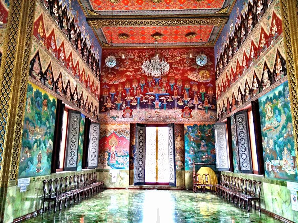2.อุโบสถจตุรมุขหินอ่อนที่มีความสวยงาม โดยอุโบสถหลังนี้มีขนาดกว้าง 40 เมตร ยาว 80 เมตร ปูพื้นด้วยหินหยกสีเขียวจากเมืองการาจี ประเทศปากีสถาน ภายประดิษฐานพระประธานบนฐานสูง บานหน้าต่างด้านนอกลงรักฝังมุกเป็นภาพตราพระราชลัญจกร ตั้งแต่รัชกาลที่ 1 ถึงรัชกาลปัจจุบัน พระนามาภิไธยของสมเด็จพระนางเจ้าสิริกิติ์ พระบรมราชินีนาถ และพระบรมวงศานุวงศ์ ตลอดจนภาพเครื่องอิสริยาภรณ์ชั้นต่างๆ นอกจากนี้บริเวณฝาผนังโดยรอบพระอุโบสถ ยังมีภาพจิตรกรรมฝาผนังเรื่องราวเกี่ยวกับพุทธประวัติและนิทานชาดกที่ประณีต ฝีมือของจิตรกรหญิงนิตยา ศักดิ์เจริญ ซึ่งใช้เวลาในการวาดนานถึง 6 ปี