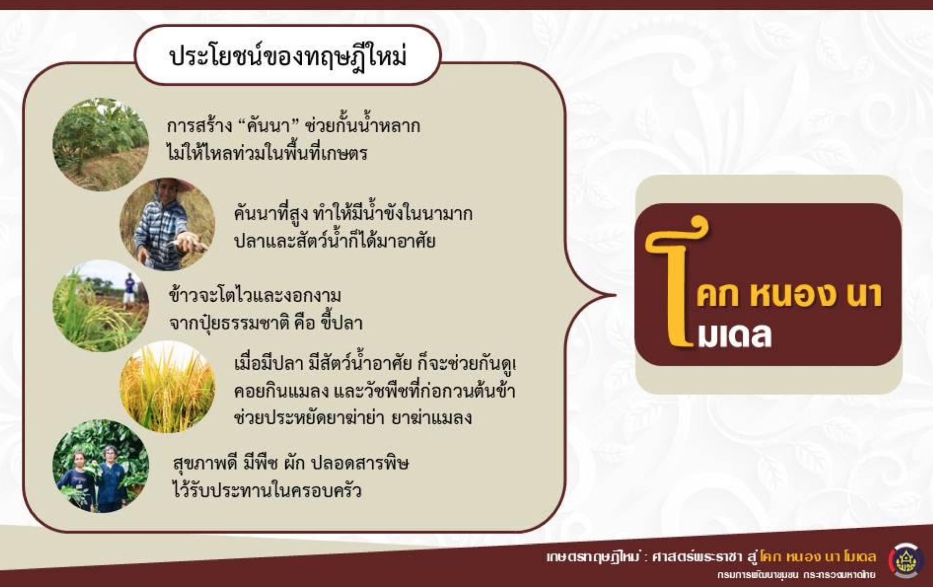 ในหลวง ร.9 ได้พระราชทานแนวคิดเรื่องเกษตรทฤษฎีใหม่ เพื่อช่วยเกษตรกรรายเล็ก ที่อาจจะมีที่ดินห่างไกลจากแหล่งน้ำ ให้จัดสรรพื้นที่ ในรูปแบบ “โคก หนอง นา” ที่จะช่วยให้เกษตรกรมีน้ำใช้แม้ในหน้าแล้ง