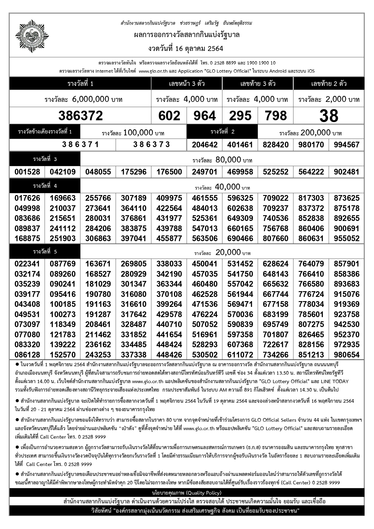 "ตรวจหวย 16 ตุลาคม 2564" ผลรางวัลสลากกินแบ่งรัฐบาล ผลหวยงวดนี้ 16/10/64