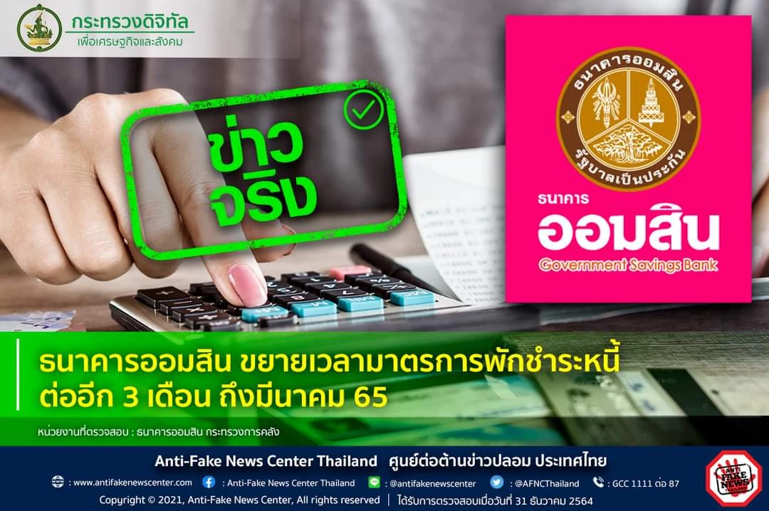 ศูนย์ต่อต้านข่าวปลอม เผย "ธนาคารออมสิน" ขยายเวลามาตรการ "พักชำระหนี้" ต่ออีก 3 เดือน ถึงมีนาคม 65 จริงหรือ? ดูรายระเอียดที่นี่