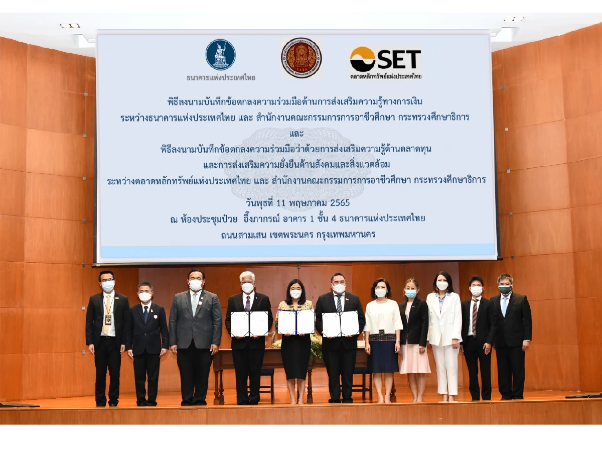สำนักงานคณะกรรมการการอาชีวศึกษา(สอศ.) ได้ลงนามความร่วมมือกับธนาคารแห่งประเทศไทย หรือ “แบงค์ชาติ” และ “ตลาดหลักทรัพย์แห่งประเทศไทย” เพื่อพัฒนากำลังคนอาชีวศึกษาด้านความรู้ทางการเงิน ตลาดทุน และความยั่งยืนด้านสังคมและสิ่งแวดล้อม ที่ห้องประชุมป๋วย อึ๊งภากรณ์ อาคาร 1ชั้น 4 ธนาคารแห่งประเทศไทย โดยมีดร.สุเทพ แก่งสันเทียะ เลขาธิการคณะกรรมการการอาชีวศึกษา(เลขาธิการกอศ.) นางสาววชิรา อารมย์ดี รองผู้ว่าด้านบริหาร ธนาคารแห่งประเทศไทย และ นายศรพล ตุลยะเสถียร รองผู้จัดการ หัวหน้าสายงานวางแผนกลยุทธ์องค์กร และสายงานพัฒนาความยั่งยืนตลาดทุน ตลาดหลักทรัพย์แห่งประเทศไทย ร่วมเป็นประธานลงนาม