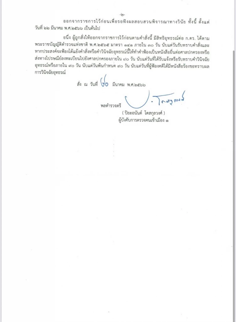ทั้งนี้ ผู้ถูกสั่งให้ออกจากราชการไว้ก่อนตามคำสั่ง มีสิทธิอุทธรณ์ต่อ ก.ตร. ได้ตาม พระราชบัญญัติตำรวจแห่งชาติ พ.ศ.2565 มาตรา 141 ภายใน 30 วัน นับแต่วันรับทราบคำสั่งและหากประสงค์จะฟ้องโต้แย้งคำสั่งหรือคำวินิจฉัยอุทธรณ์นี้ให้ทำคำฟ้องเป็นหนังสือยื่นต่อศาลปกครองหรือส่งทางไปรษณีย์ลงทะเบียนไปยังศาลปกครองภายใน 90 วัน นับแต่วันที่ได้รับแจ้งหรือรับทราบคำวินิจฉัยอุทธรณ์หรือภายใน 90 วัน นับแต่วันพ้นกำหนด 90 วัน นับแต่วันที่ผู้ฟ้องคดีได้มีหนังสือร้องขอทราบผลการวินิจฉัยอุทธรณ์