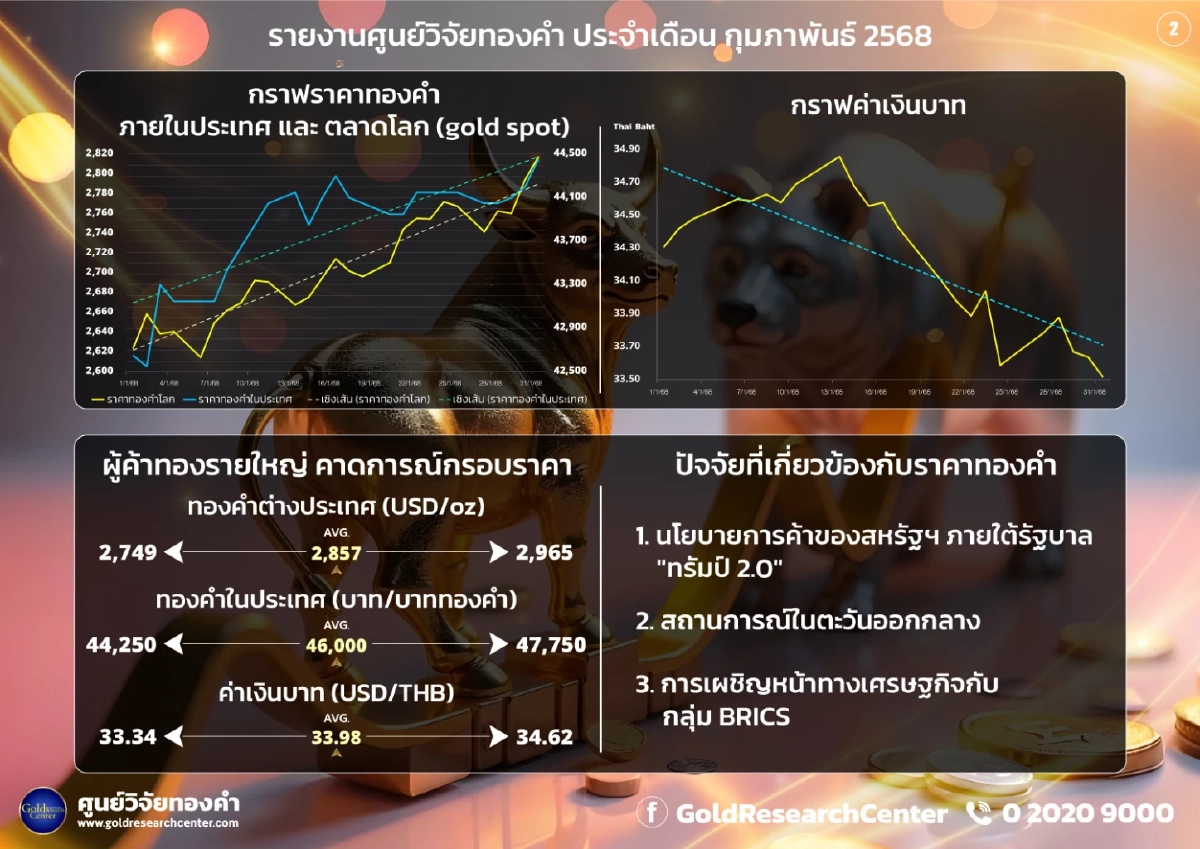สำหรับการคาดการณ์กรอบราคาทองคำในเดือน กุมภาพันธ์ 2568 ของผู้ประกอบกิจการค้าทองคำรายใหญ่มีมุมมอง ดังนี้ ราคาทองคำตลาดโลก (Gold Spot) ให้กรอบเฉลี่ยบริเวณ 2,749 – 2,965 ดอลลาร์สหรัฐฯ ต่อออนซ์ ด้านราคาทองคำแท่งในประเทศความบริสุทธิ์ 96.5% ให้กรอบเฉลี่ยบริเวณ 44,250 – 47,750 บาทต่อน้ำหนัก 1 บาททองคำ และด้านค่าเงินบาท ให้กรอบเฉลี่ยบริเวณ 33.34 – 34.62 บาท ต่อดอลลาร์สหรัฐฯ