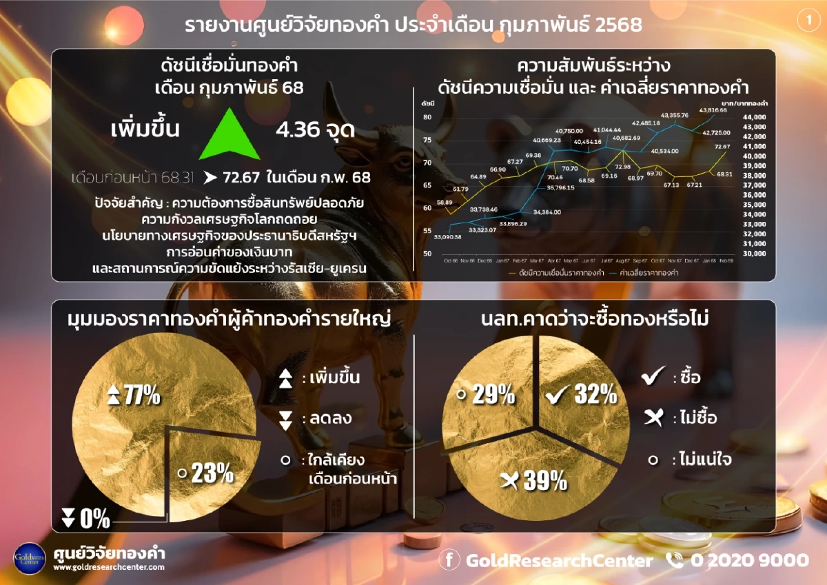ดร.พิบูลย์ฤทธิ์ วิริยะผล ผู้อำนวยการศูนย์วิจัยทองคำ แถลงดัชนีความเชื่อมั่นราคาทองคำประจำเดือน กุมภาพันธ์ 2568 ปรับเพิ่มขึ้นเมื่อเทียบกับเดือน มกราคม 2568 ที่ผ่านมา จากระดับ 68.31 จุด มาอยู่ที่ระดับ 72.67 เพิ่มขึ้น 4.36 จุด หรือคิดเป็น 6.39% โดยปัจจัยที่ทำให้ดัชนีฯ ปรับเพิ่มขึ้นเมื่อเทียบกับเดือน มกราคม 2568 ที่ผ่านมา จากระดับ 68.31 จุด มาอยู่ที่ระดับ 72.67 เพิ่มขึ้น 4.36 จุด หรือคิดเป็น 6.39% โดยปัจจัยที่ทำให้ดัชนีฯ ปรับเพิ่มขึ้นนั้น ได้แก่ ความต้องการซื้อสินทรัพย์ปลอดภัย ความกังวลเศรษฐกิจโลกถดถอย นโยบายทางเศรษฐกิจของประธานาธิบดีสหรัฐฯ และการอ่อนค่าของเงินบาท