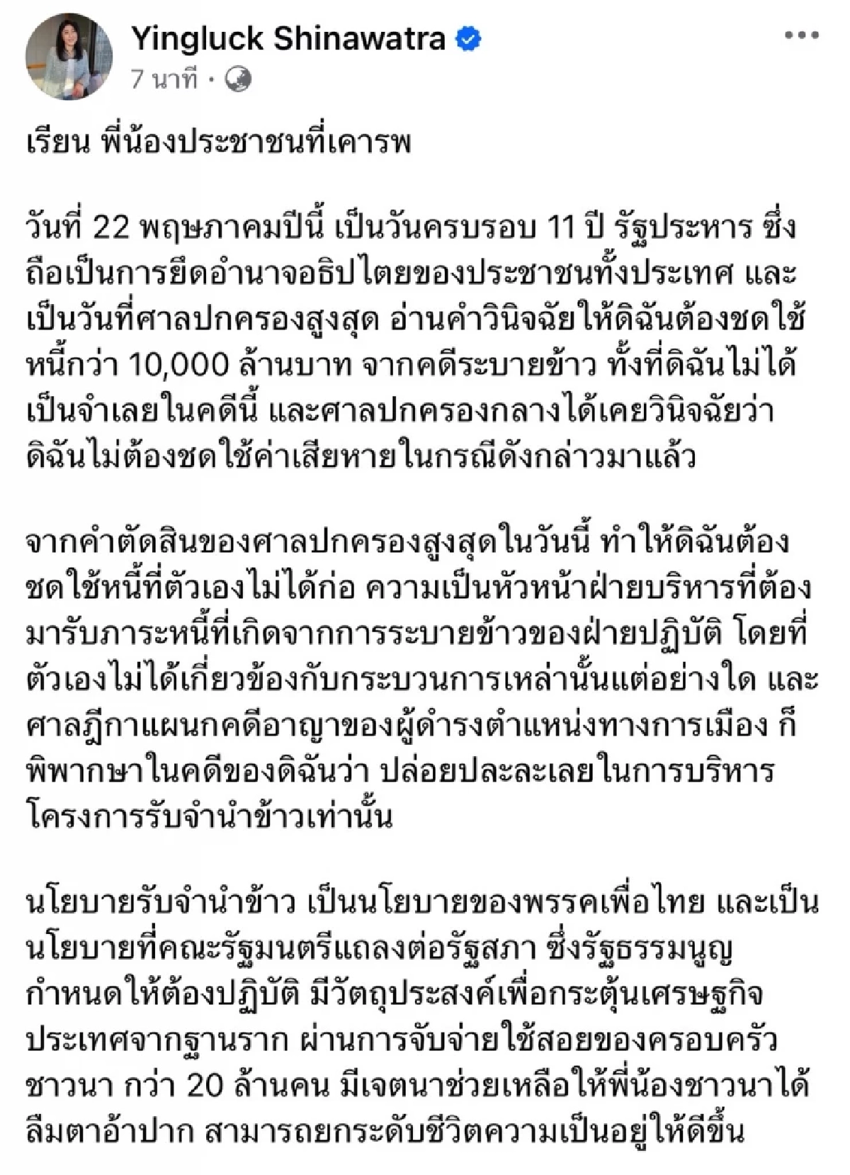 ล่าสุด นางสาวยิ่งลักษณ์ ชินวัตร ได้โพสต์ข้อความผ่านเฟซบุ๊กส่วนตัว รายละเอียดระบุว่า เรียน พี่น้องประชาชนที่เคารพ วันที่ 22 พฤษภาคมปีนี้ เป็นวันครบรอบ 11 ปี รัฐประหาร ซึ่งถือเป็นการยึดอำนาจอธิปไตยของประชาชนทั้งประเทศ และเป็นวันที่ศาลปกครองสูงสุด อ่านคำวินิจฉัยให้ดิฉันต้องชดใช้หนี้กว่า 10,000 ล้านบาท จากคดีระบายข้าว ทั้งที่ดิฉันไม่ได้เป็นจำเลยในคดีนี้ และศาลปกครองกลางได้เคยวินิจฉัยว่าดิฉันไม่ต้องชดใช้ค่าเสียหายในกรณีดังกล่าวมาแล้ว