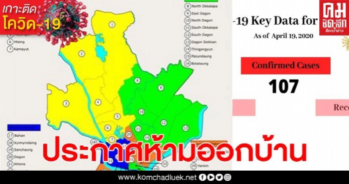 ค่ำวันที่ 19 เม.ย.2563 กระทรวงสาธารณสุขและกีฬาของสาธารณรัฐแห่งสหภาพเมียนมา ยืนยันพบผู้ป่วยติดเชื้อไวรัสโควิดสะสม 107 ราย เสียชีวิต 5 ราย รักษาหาย 5 ราย และกําลังรับการรักษาพยาบาล 88 ราย