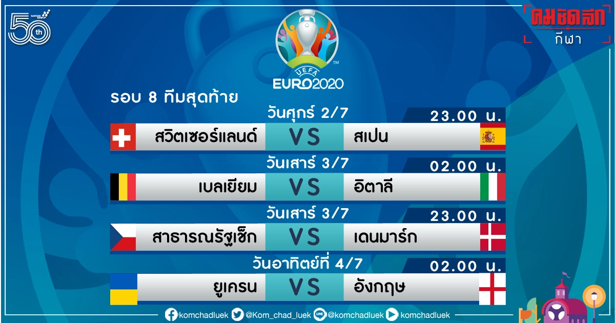 ฟุตบอลชิงแชมป์แห่งชาติยุโรป “ ยูโร 2020” เข้าสู่การแข่งขันในรอบ 8 ทีม สุดท้าย หรือ รอบก่อนรองชนะเลิศ เริ่มตั้งแต่วันศุกร์ที่ 2 ก.ค. เป็นต้นไป คู่แรก สวิตเซอร์แลนด์ พบกับ สเปน แข่งกันในเวลา 23.00 น. ตามเวลาในไทย , คู่ที่ 2 แข่งกันในเวลา 02.00 น. (เข้าสู่วันเสาร์ที่ 3 ก.ค. ) เบลเยียม พบ อิตาลี