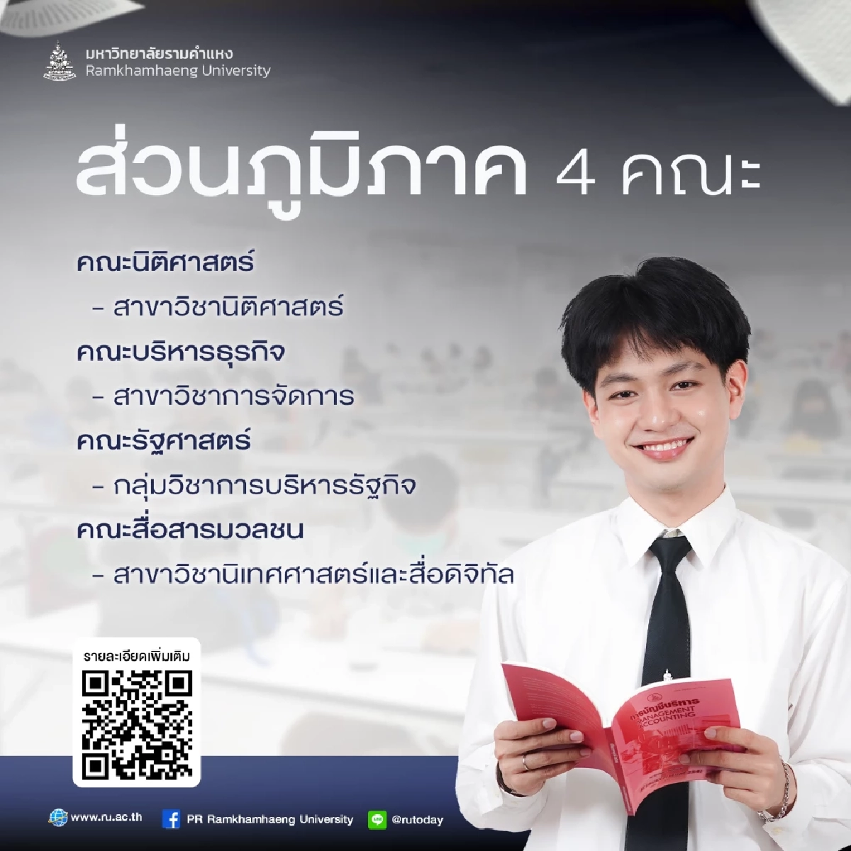สอบถามรายละเอียดเพิ่มเติมได้ที่ ฝ่ายรับสมัคร สํานักบริการทางวิชาการและทดสอบประเมินผล โทร. 02-310-8614-15, 02-310-8623-24 เว็บไซต์ www.ru.ac.th ติดตามข่าวสารผ่าน Facebook : PR Ramkhamhaeng University