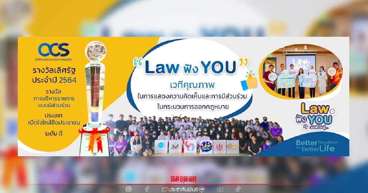 การจัดกิจกรรม “Law ฟัง You” เป็นอีกหนึ่งรูปแบบการสื่อสารข้อมูลด้านกฎหมายไปสู่ภาคประชาชนที่สามารถบอกเล่าเรื่องราว มีการพูดคุยแลกเปลี่ยนความคิดเห็น และข้อเสนอแนะต่าง ๆ ที่เป็นประโยชน์ และเป็นกิจกรรมอีกหนึ่งความภาคภูมิใจที่ทำให้สำนักงานฯ ได้รับ “รางวัลเลิศรัฐ” สาขาการบริหารราชการแบบมีส่วนร่วม ประเภทเปิดใจใกล้ชิดประชาชน ระดับดี : Law ฟัง You โดยสำนักงาน ก.พ.ร. ได้จัดพิธีมอบรางวัลเลิศรัฐ ประจำปี 2564 เมื่อวันที่ 16 กันยายน 2564 โดยมีนายวิษณุ เครืองาม รองนายกรัฐมนตรี เป็นประธานในพิธีเปิดและมอบรางวัล